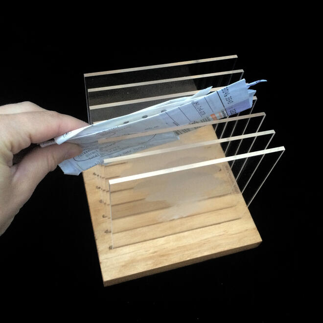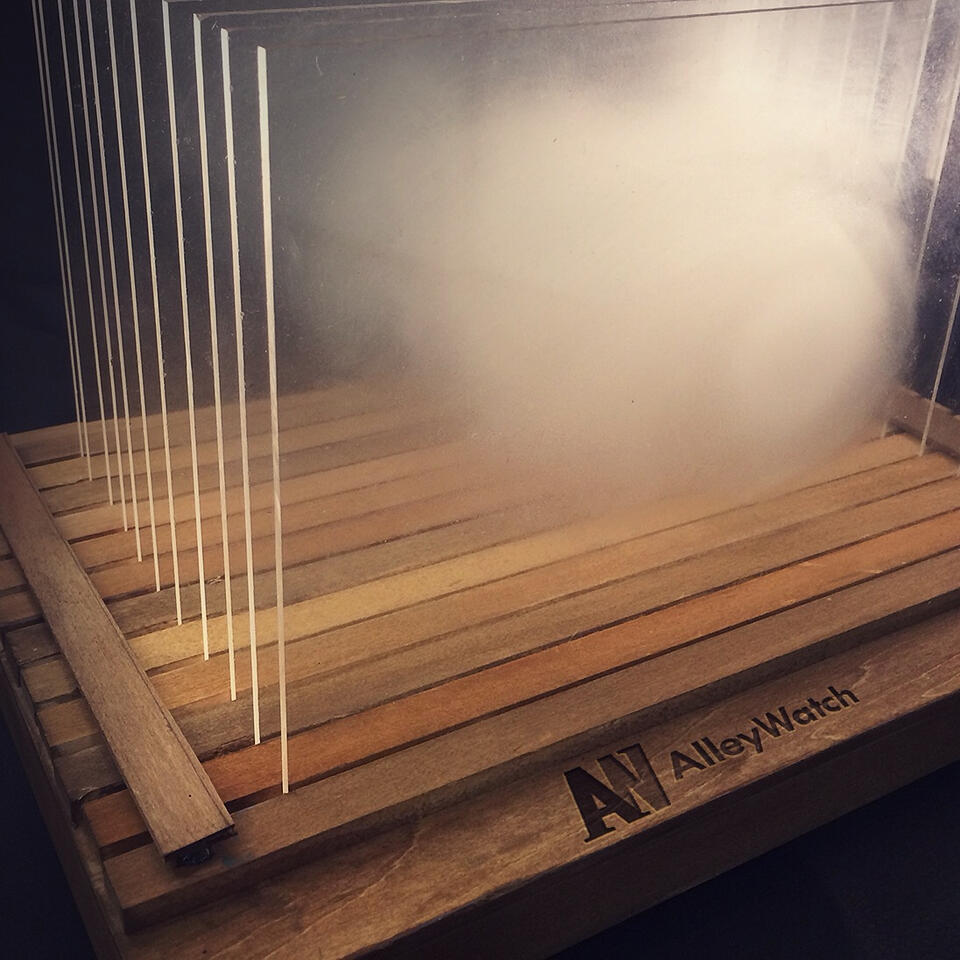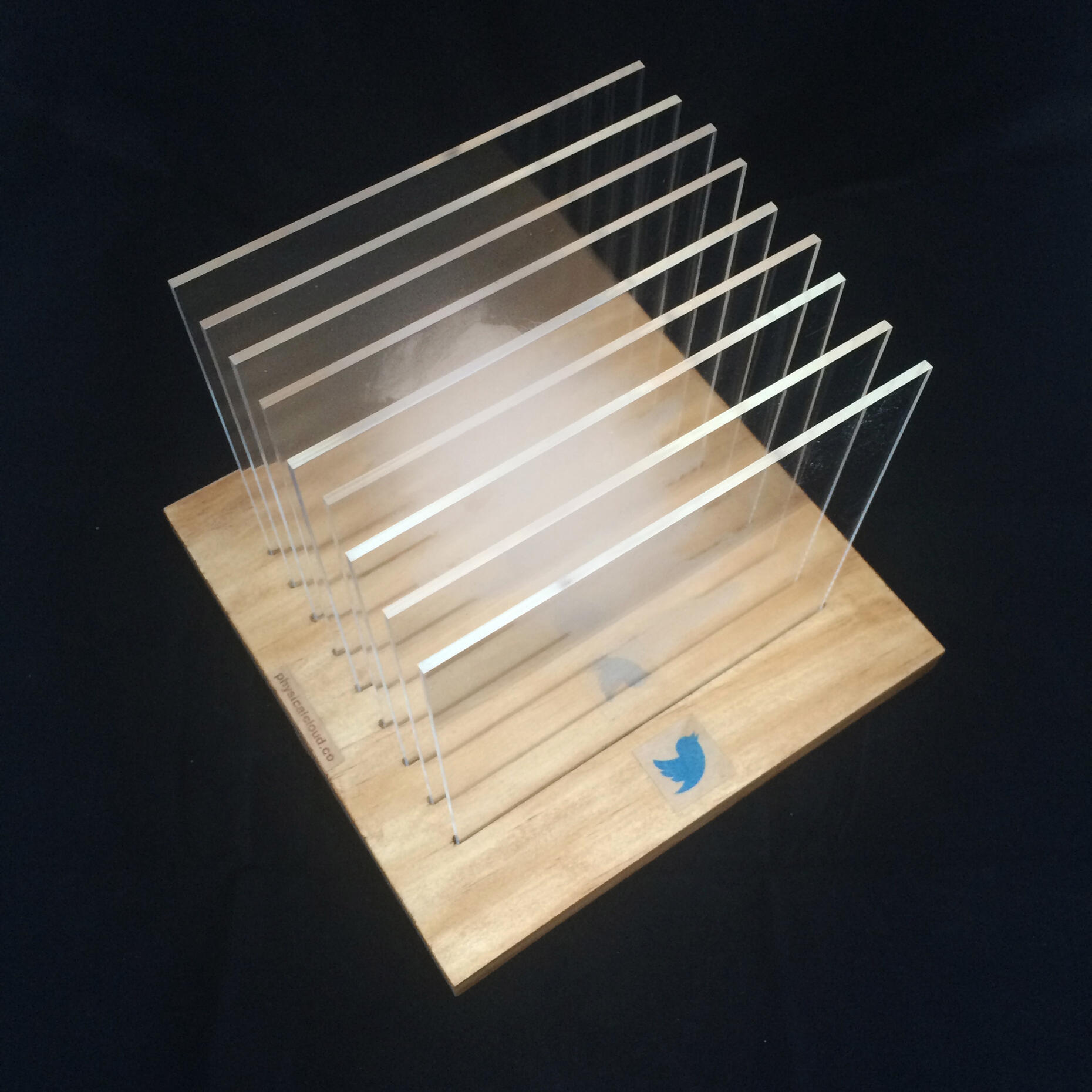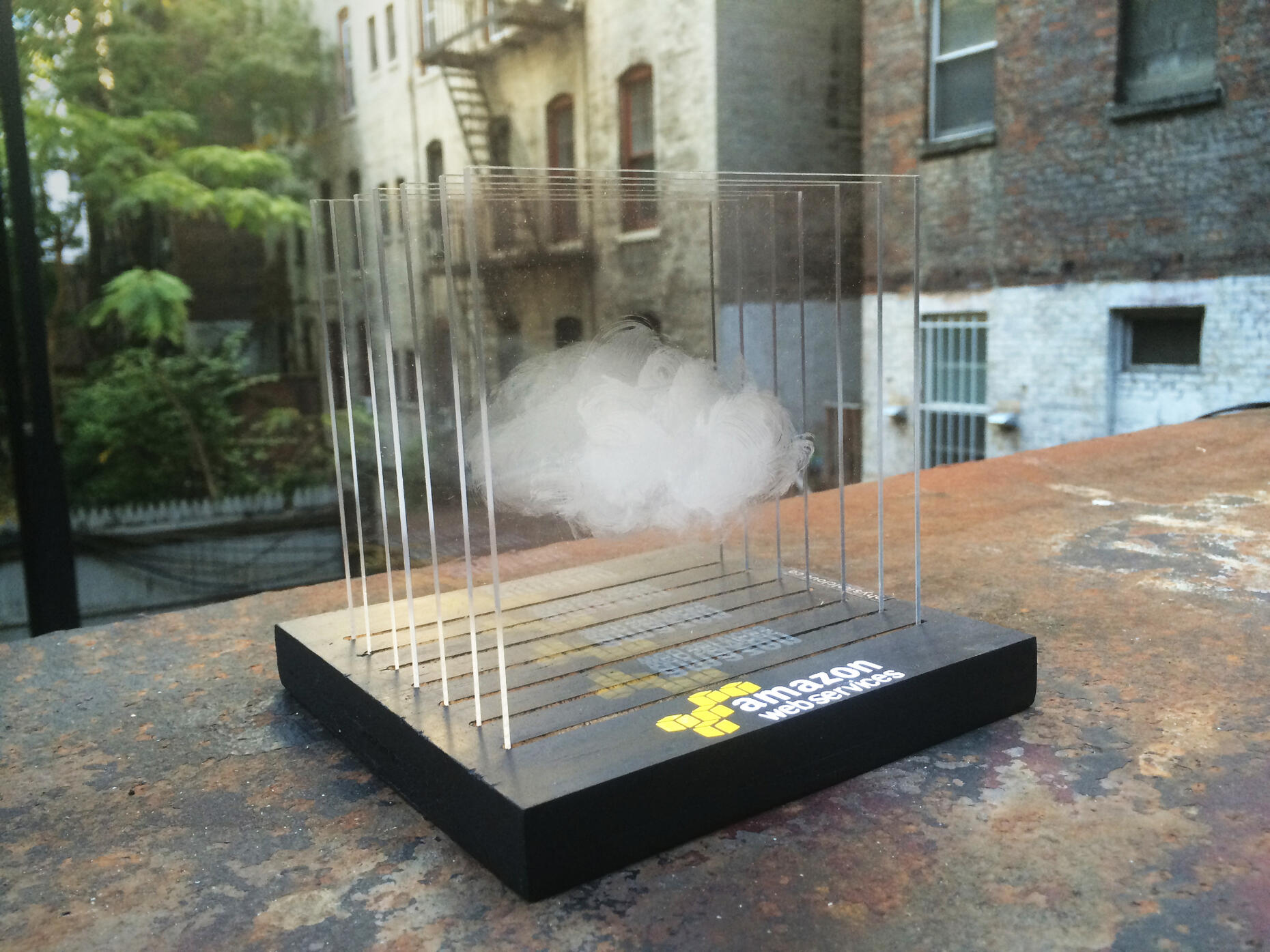We've created a physical desktop-sized cloud that functions as a file folder / storage unit. When there's nothing in it, there's an optical illusion of a floating cloud. When objects are placed in it, they appear to be floating in that cloud.Each cloud is a unique optical illusion hand-made out of polycarbonate planes, acetone, and wood in our studio in San Francisco. To create branded clouds, we will print your logo on the wood base. For larger volume brand-emblazoned requests, we can laser-etch your logo. We can also make customized clouds out of other materials such as metal and glass upon request.
